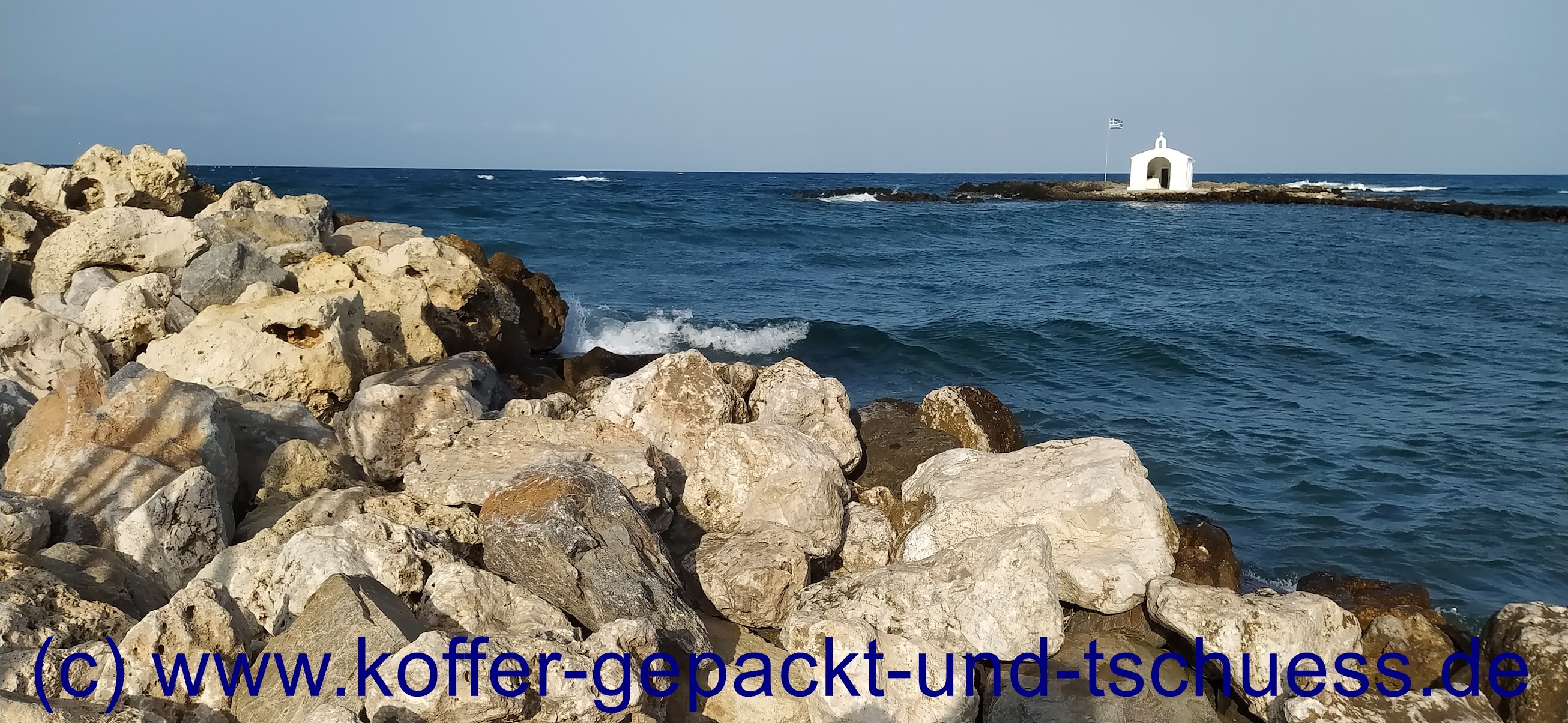 Wir kamen überpünktlich nach nur 2 ¾ Stunden Flugzeit in Chania an und fuhren dann mit dem Transferbus nach Georgioupolis. Der kleine ehemalige Fischerhafen liegt ca. 50 km östlich von Chania an der Nordküste Kretas. Die Busfahrt dauerte nur 55 Minuten. Setzt euch wenn möglich im Bus auf die linke Seite, dann könnt ihr die tollen Panoramen an der Küste sehen und fotografieren.